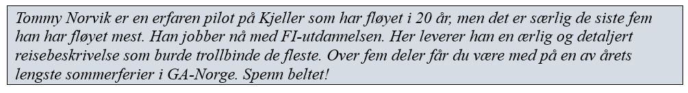 Gjennom å lese disse reisebrevene vil du forhåpentligvis både tørre og ikke minst få lyst selv. Norge er et usedvanlig vakkert «VFR-land». Ordentlig dårlig vær kan forekomme; da smaker vafler og kaffe ekstra godt. Halvdårlig eller halvgodt vær inntreffer, men da blir ofte «3D-effekten» ennå flottere. Har du «sky clear» blir det enkelt å følge kyst, fjord eller dal kontra våre flate naboland i øst og syd.