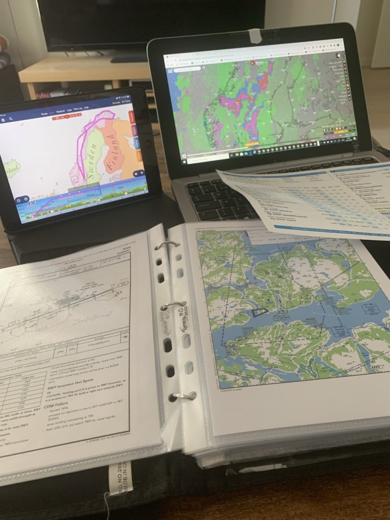 Vi gjorde grovplanleggingen i forkant, mens detaljene for hver legg ble gjort dagen før. Alle kart for flyplassene ble skrevet ut i papirform.