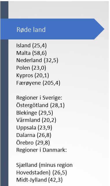 Følgende land og regioner (tall for antall positive tilfeller per 100 000 de siste to ukene i parentes) er røde: