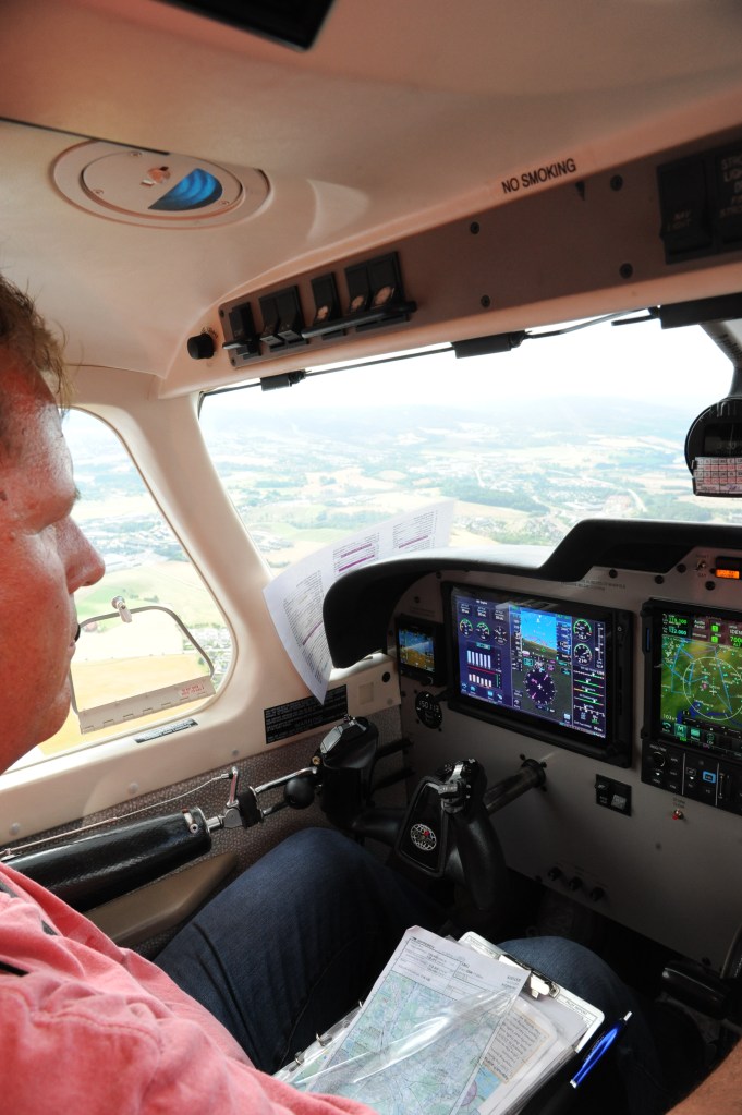 Han demonstrerer hvordan avionikken nå også passer litt på han: