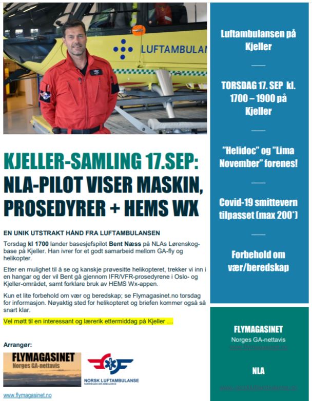I morgen torsdag klokken 1710 lander «Helidoc» på Kjeller. Bak stikka er basesjefpilot Bent Næss på Norsk Luftambulanses (NLA) Lørenskog-basen. Han ivrer for et godt samarbeid mellom GA-fly og helikopter.