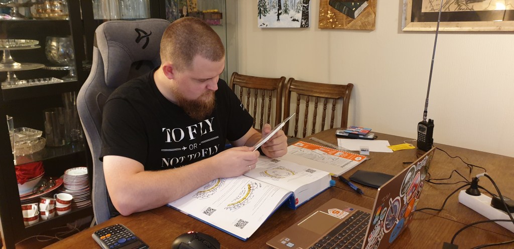 -Tipper jeg er på rundt en 15 – 25 timer til sammen i uka nå. Samt påfyll av en god dose relevant innhold på YouTube og google. Men jeg kan spørre kursholderen også om jeg lurer på noe, men hittil har jeg klart meg selv. Til min bedre halvdels fortvilelse har det blitt en hel del lytting på flyradioen i stua (om jeg får lov til å dele et tips: å lytte på liveatc.net er fantastisk god trening).