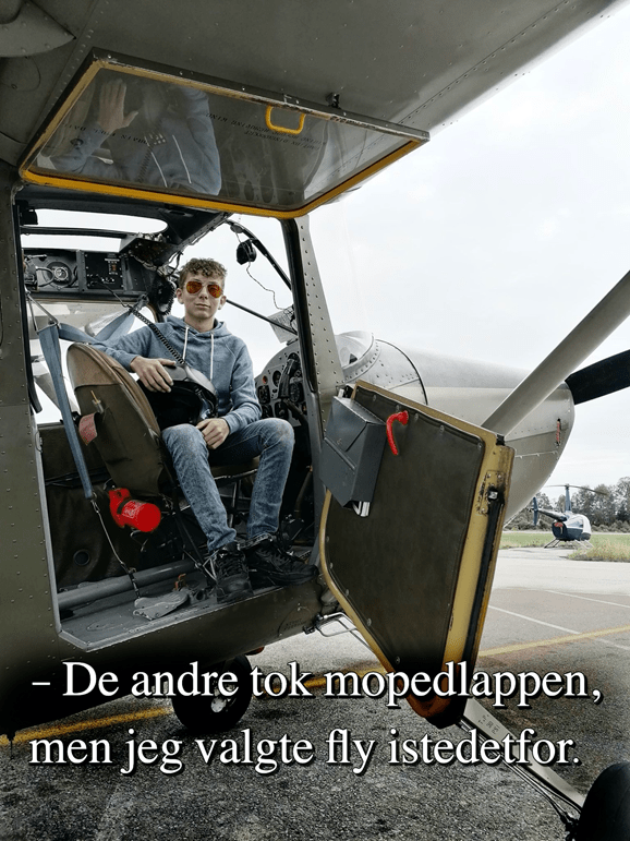 – Jeg fikk være med faren til en venn av meg som har PPL-A på en flytur i en Cessna 172 med så kalt glasscockpit. Det er noe jeg ikke kommer til å glemme. – Følelsen av å holde i stikka å føre flyet selv er noe helt eget, forteller han. Foreløpig én time i loggen.