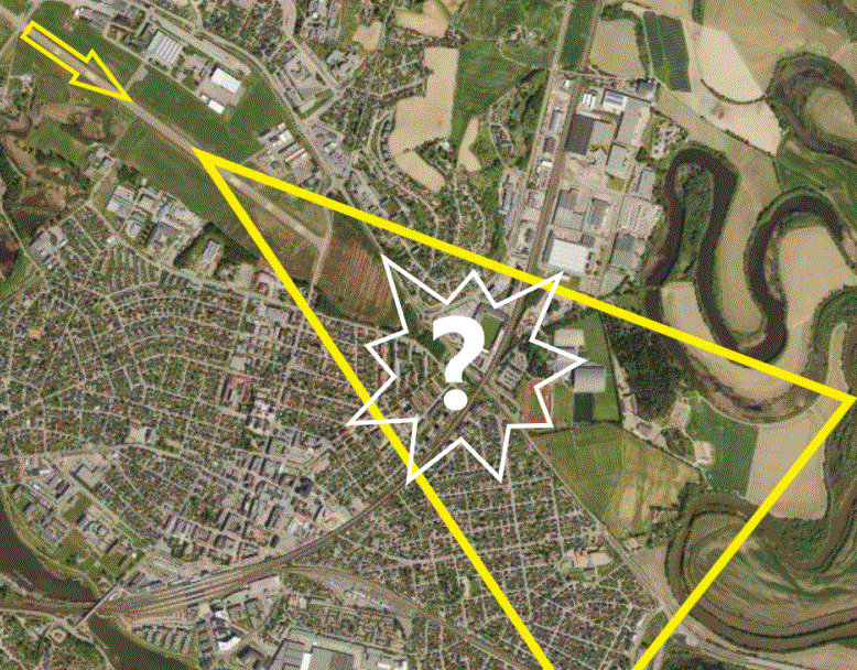 Finn flyplassen i et google- eller Norgeskart og legg mitt «trekant-symbol» over begge utflygingstraseene. To-tre kilometer rett frem og 20 grader til sidene. Hvor kan du nødlande i denne sektoren?