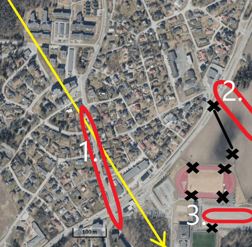 Husk at du har en liten bonus i og med terrenget som er lavere enn banen (bruk https://norgeskart.no/ til å planlegge). Du ser høydekurvene nede i byen er rundt 150 meter (492 fot elevasjon). Det gir deg 260 fot mer luft noe som gir deg om lag 650 meter lenger glidedistanse.