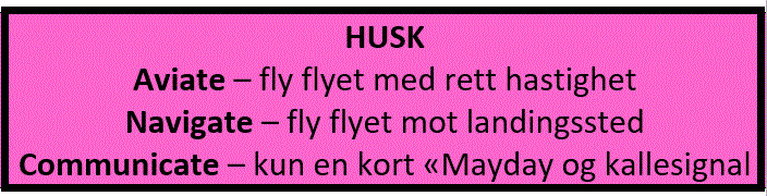 Skjer det noe med motoren nå, må du vite hvilken vei du skal tørne (mot vinden), etablerte glide-hastighet, vurdere flap og ikke minst melde «Mayday – Lima Bravo Charlie – returning runway 30».