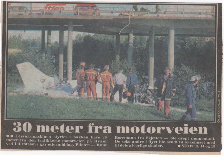 En Cessna 206 fullastet med fallskjermhoppere klatret ut fra Kjeller bane 30 samme året, da motoren kuttet i 500 fot. Piloten gjorde alt rett – fløy rett frem – men traff på tvers av motorveien og havarerte fatalt.