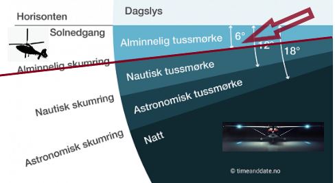 Så øker det på. Ser du på grafen (nedenunder) vil du få bekreftet at tussmørkekurven blir brattere utover våren. Reglen for å fly i dagslys tilsier at du kan være i luften bare så lenge sola er høyere enn seks grader under horisonten.