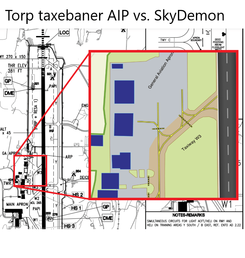 -Hvor er holding-point Golf? Jeg forventet meg holding point Whiskey 3. Sjekker i SkyDemon og «airport chart» uten å finne Golf. Heldigvis viser SkyDemon en linje mellom GA-parkeringen og taksebane W3. Det må være den.