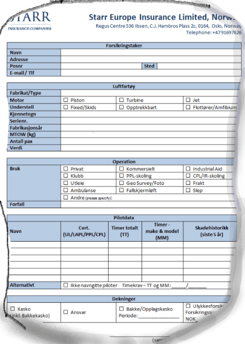 Disse ringte tilbake etter fire timer, der kundekonsulenten er i Oslo. STARR sin policy er å heller snakke direkte med kunden og danne seg et inntrykk av fly, eier og type operasjon – og på basis av dette tilby en forsikring og da naturligvis gjennom utfylling av et skjema. Dette er også relativt intuitivt.