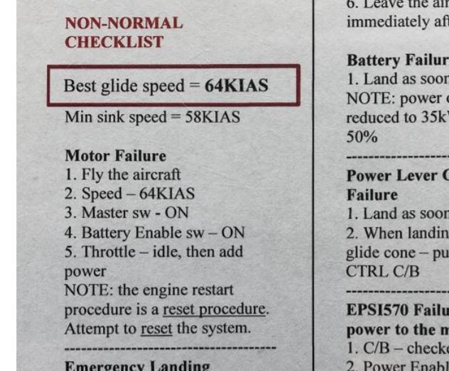 Beste glidetall i tilfelle motorbortfall er 15:1, som opprettholdes best ved å fly 64 knop.