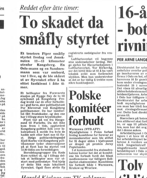 Begge om bord ble alvorlig skadet, men overlevde. Til tross for at flyet havarerte nær bebyggelse på Østlandet, ble det ikke funnet før etter flere timer. Da var begge svært forkomne, til tross for at de hadde tent opp bål.