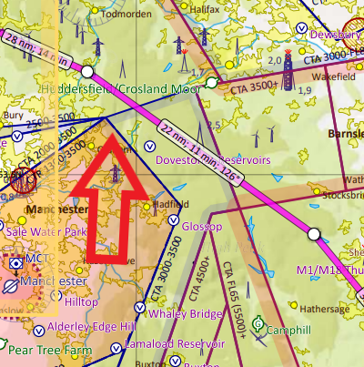 Derfor lager vi en knekk allerede like etter start fra badebyen, slik at flyr utenom Manchester-området.