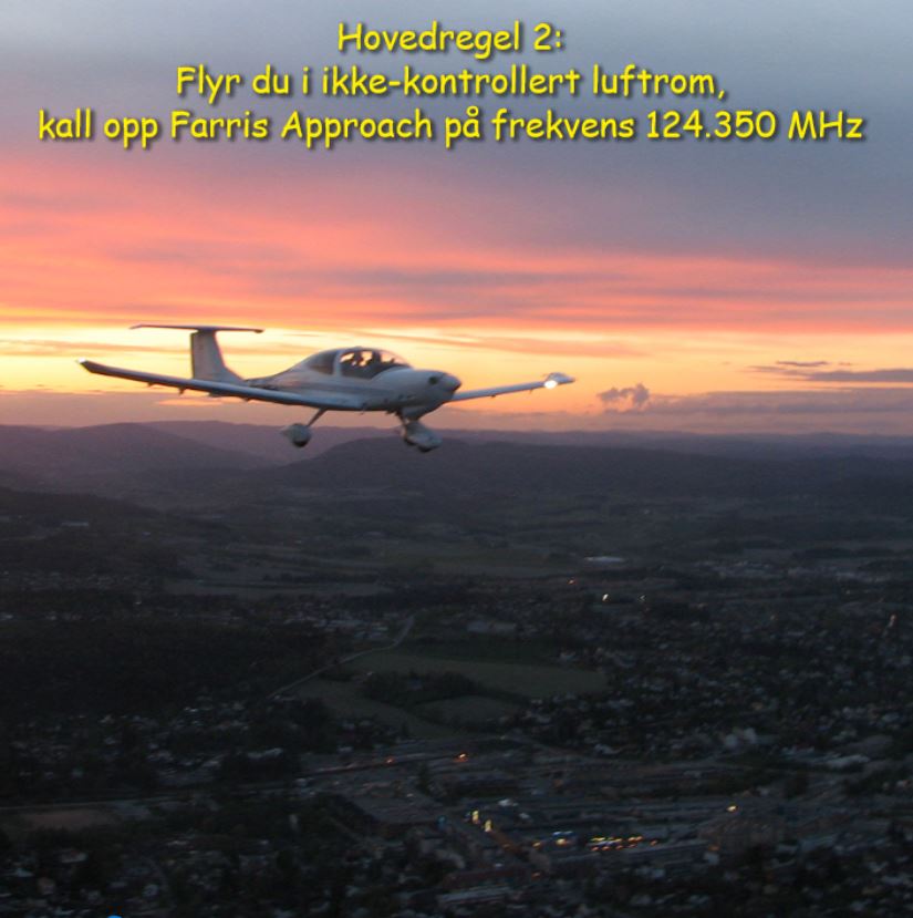 -Et eksempel: Farris er bemannet med to flygeledere. Du passerer Drammen i 2000 fot og sjekker inn på Farris Approach på 124,350 for FIS (Flight information). Når du kommer til Horten ønsker du å sette kurs mot Gaustadtoppen og ber om 6000 fot. Du vil da bli instruert til å kalle opp Farris på 134,050 for klarering. Hvis det ikke er mulig å klarere opp i C-luft på grunn av annen trafikk, vil du få beskjed om å fortsette under TMA og forbli på 124,350 for FIS.