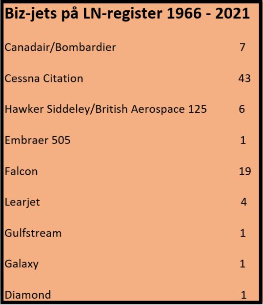 Av de ni ulike flytypene, har amerikanske Citation vært registrert hele 43 ganger