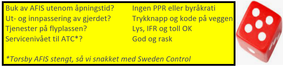 I motsetning til Norge har svenskene et langt mer brukervennlig system for å bruke AFIS-flyplasser utenom åpningstid. Ingen PPR og prosedyre om «overflyging av banen før landing» holder i massevis.